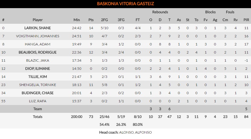 Si observamos con más detalle la estadística, no es más que el fiel reflejo del total de acierto sumado por sus compañeros, que terminó en menos del 30% en TC y del 40% en TL, los cuales contrastaban con el de Baskonia, que, sin ser muy alto, logró un 54% en TC y 80% en TL. Y todo ello gracias a los más de diez puntos de Larkin (14), Beaubois (12), Shengelia (11) y Voigtmann (10); por no hablar de los 9 puntos, 8 rebotes y 17 de valoración de Hanga, el mejor del partido. El rebote final, escalofriante: 47-28, con Tillie capturando hasta 9 rechaces.