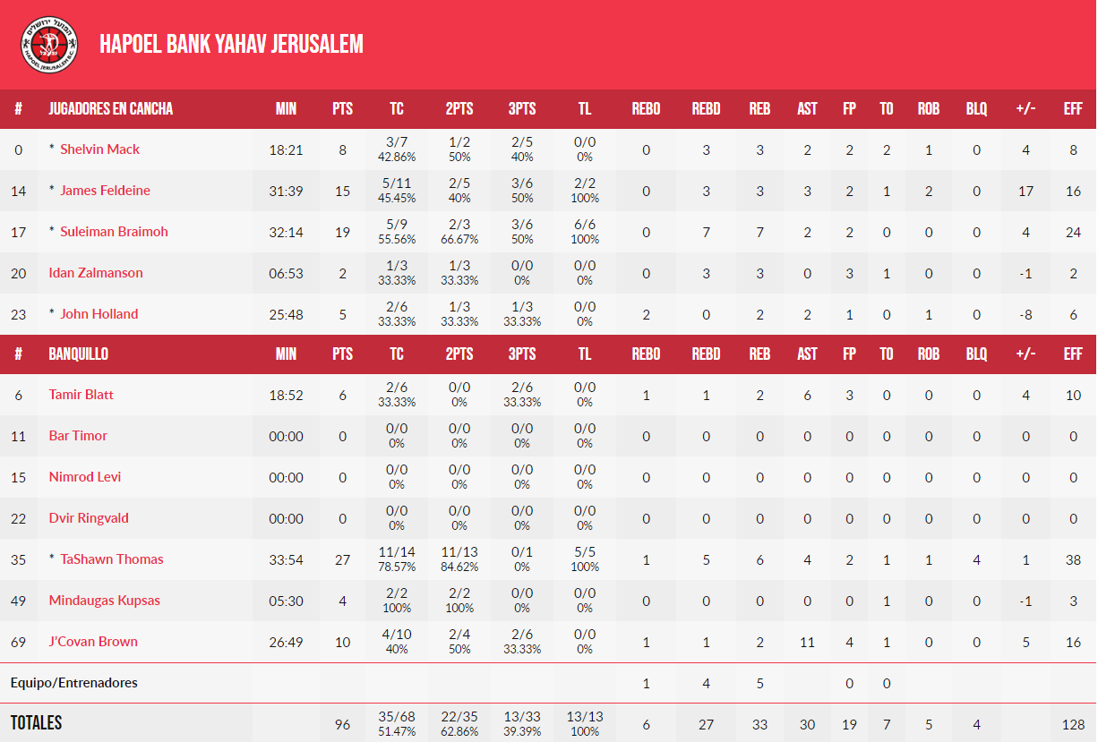 Un todoterreno eficaz: Sobresaliente fue el partido de TaShawn Thomas desde el inicio del partido. Siempre activo en ataque, se convirtió rápidamente en la primera opción del equipo israelí y no defraudó. A base de potencia y algo de muñeca, Thomas sustentó en todo momento a los suyos en el marcador, además de apoyar en el rebote, en la labor de asistente y como intimidador. Sus espectaculares números fueron de 27 puntos, 6 rebotes, 4 asistencias y 4 tapones para 38 de valoración.