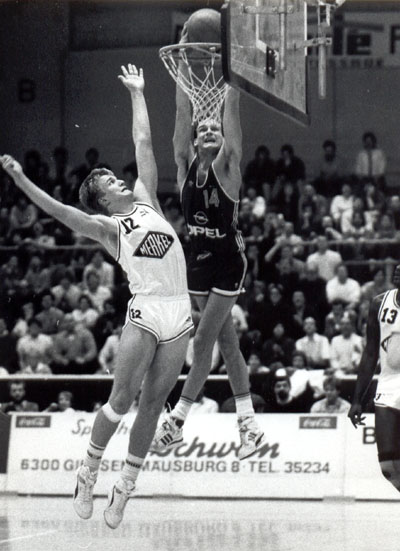 Su llegada al club no fue menos importante que la del Segundo Entrenador. Recién llegado de ejercer de assistant coach en la Universidad de Fresno State, conocida en la época por ser el refugio preferido de toda medianía holandesa que pasara de los dos metros, The Man in Black o, lo que es lo mismo, Dirk Bauermann iba a dar comienzo a una sucesión de 7 Ligas consecutivas para TSV, acompañadas por 5 Pokals (Copas). A partir del segundo año, Bauermann ejerció ya de Primer Entrenador. En ese período, Harnisch anotaría 4068 puntos repartidos en 269 partidos. El quinteto más usado en los primeros años fue el de Michael Köch como base, el alemán mulato con pasaporte inglés Jon Johnson como escolta. Johnson formaba parte de aquella selección británica que se enfrentó a España en el preolímpico de Los Angeles y aprovechó la ocasión para cascarnos 44 puntazos. Henning Harnisch era el 3, con Kannard Johnson, recién cortado por Cleveland como 4. Kannard destacaba más por su tiro de media-larga distancia que por otra cosa, 2'07 también zurdo. El quinteto lo cerraba Günther Behnke, el 2'21 más coordinado que he visto en mi vida después de Ralph Sampson y Rik Smits. Con el tiempo, Clinton Wheeler le iría comiendo la tostada a Köch hasta hacerse con la titularidad. Hansi Gnad, Christian Welp, Jens Kujawa y, directamente desde Girona, Abdul Shamshid-Deen fueron otros de los interiores de la época.