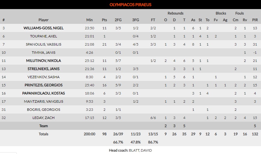 - Vassilis Spanoulis, el “sheriff” de la Euroliga. Fue el auténtico líder de Olympiacos, y demostró por qué es considerado uno de los mejores bases de Europa. Partido muy eficiente del griego, con 21 puntos, 4 rebotes, 8 asistencias y 1 robo en 21 minutos, para irse hasta los 31 de valoración.