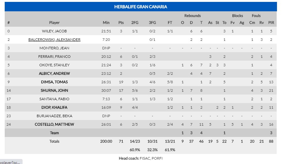 Con la baja de Beqa Burjanadze, Porfi Fisac necesitaba sacar la mejor versión de su juego interior, para así tambien aprovechar las bajas del Dolomiti Energia Trento en los puestos de 4 y 5. La responsabilidad en ataque llegó con John Shurna, el tirador impasible, y la defensa estuvo a cargo de Matt Costello, pívot que no está teniendo el impacto que tuvo la temporada pasada, pero que sí que está cuando se le necesita. Con ambos jugadores enchufados, el Herbalife Gran Canaria logró poner tierra de por medio, sobretodo en la segunda parte, que fue cuando se construyó la ventaja ganadora. Otro que también merece una mención especial es Tomas Dimsa, escolta lituano que demostró su potencial con 19 puntos, siendo este su mejor encuentro desde que pertenece a la entidad canaria.