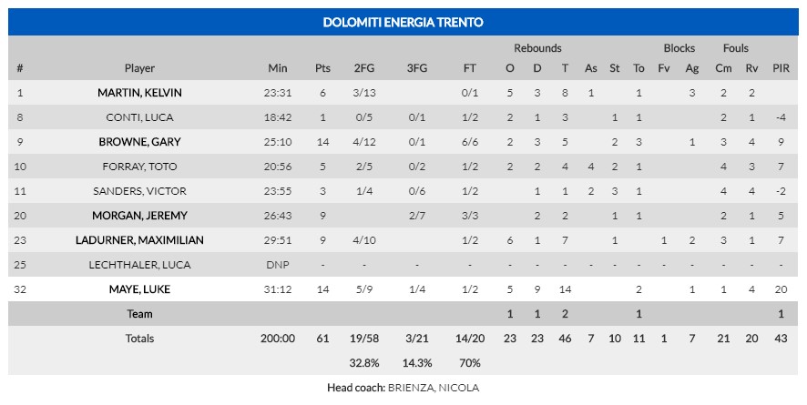 Sin Jacorey Williams y sin Davide Pascolo, el Dolomiti Energia Trento veía como su juego interior llegaba claramente debilitado al Gran Canaria Arena. Sin uno de sus mejores jugadores (Jacorey Williams), el juego interior necesitaba de un protagonista para mantener vivos ambos aros, y ese invitado de lujo fue Luke Maye. El ala-pívot estadounidense está afrotando esta temporada su campaña rookie en Europa, y en el día de hoy dejó una gran actuación. Rápido de pies y manos, buena posición a la hora de rebotear, y un buen tiro, Luke Maye se convirtió en un verdadero dolor de muelas para los canarios, que sólo pudieron ver de cerca como finalizaba el encuentro con 14 puntos y 14 rebotes, siendo el jugador más efectivo del conjunto azzurro con 20 créditos de valoración.