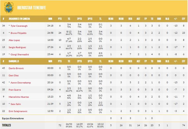 Los pequeños de Iberostar Tenerife deslumbran en la primera parte. Shermadini y Sulejmanovic no anotaron en la primera parte, mientras que Guerra sumaba dos puntos y el único interior destacado en ataque era Cavanaugh con 6 puntos. En cualquier otro partido esto habría sido una muy mala señal y probablemente los canarios irían por debajo en el marcador, pero con unos primeros minutos como los que jugaron los pequeños de Vidorreta casi hubiera dado igual jugar sin pívots en ataque. A la exhibición inicial de Fitipaldo le siguieron 14 puntos entre Huertas y Álex López a partes iguales y también Salin quiso apuntarse con 5 puntos. En total fueron 39 de los 47 puntos de Iberostar Tenerife anotados por sus exteriores, destacando especialmente sus bases.