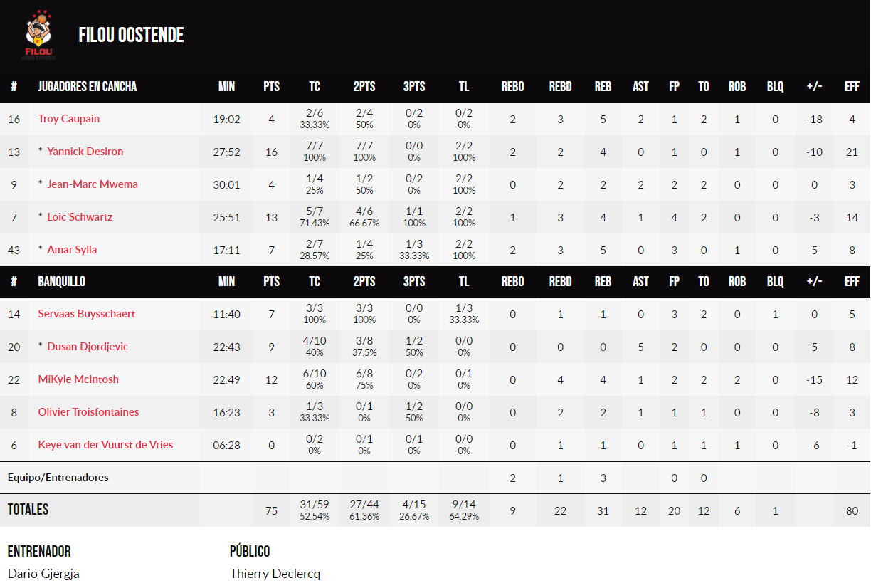 La borrachera de puntos que se vio en el primer cuarto se fue disipando hasta llegar a un último completamente amordazado y tenso. La extraordinaria defensa zonal de Oostende ya había metido en problemas a los locales y al inicio del definitivo cuarto lo hizo. Al borde de los siete minutos para el final del partido llegó el mate de Aaron White. Para entonces y por medio de McIntosh y Buysschaert el duelo se había puesto ya a un tiro de distancia (64-62, min. 33).