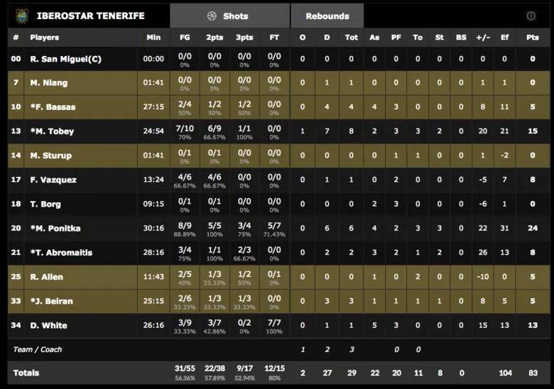 - Ponitka, a lo suyo: El alero polaco continúa con la excelente temporada y sigue siendo vital para el conjunto lagunero. Si bien uno de sus lunares suele ser el tiro exterior, hoy se resarció anotando 3/4 desde más allá del arco. La polivalencia en la cancha permite al equipo anotar con mayor fluidez, sobre todo en transición, y también se nota su ausencia cuando marcha al banquillo. Hubo momentos del partido donde faltaban referencias ofensivas ya que White no siempre puede con todo el peso del ataque. El polaco firmaba 31 créditos de valoración y luchará por el MVP de la jornada sin duda.