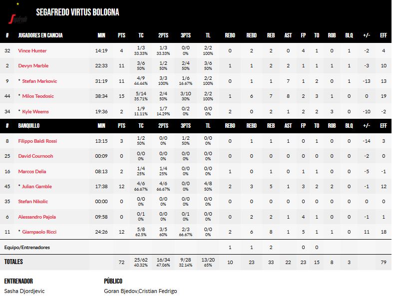No todo es Teodosic: hasta los 38 minutos se fue el genio serbio. Al final, no podía ya ni con su alma. Aún así, 15 puntos, 7 rebotes y 8 asistencias para sostener a los suyos ante todo el arsenal del Canarias. Pero nada o muy poco más. Sólo cosas intermedias de Marble, alguna de Gamble, desaparecido Hunter, lo mismo que Weems. Así, hasta para un equipo de Djordjevic se complica vencer. Hoy, Segafredo Virtus Bolonia fue mucho de Teodosic, pero no todo lo pudo ser.