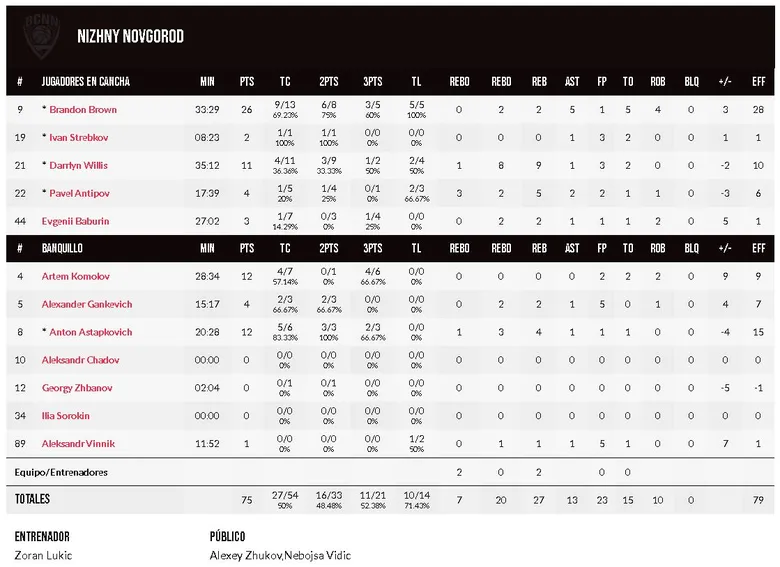 Las afinadas metralletas: aunque poco le sirvió en el segundo tiempo, mucho de su victoria la debe Nizhny a su acierto exterior. 9/12 al descanso para un 52% de acierto final que apuntalaban lo que Brown culminó al final. Especial acierto para Komolov, incapaz de anotar bandejas sin oposición, pero casi infalible desde la larga distancia. Hasta el zurdo Willis se animó a anotar en esta suerte de moda en el basket moderno para mantener las ventajas cuando se venía la enésima remontada aurinegra. Hoy, más que nunca y para suerte de su entrenador, estuvieron más que afinadas las metralletas rusas.