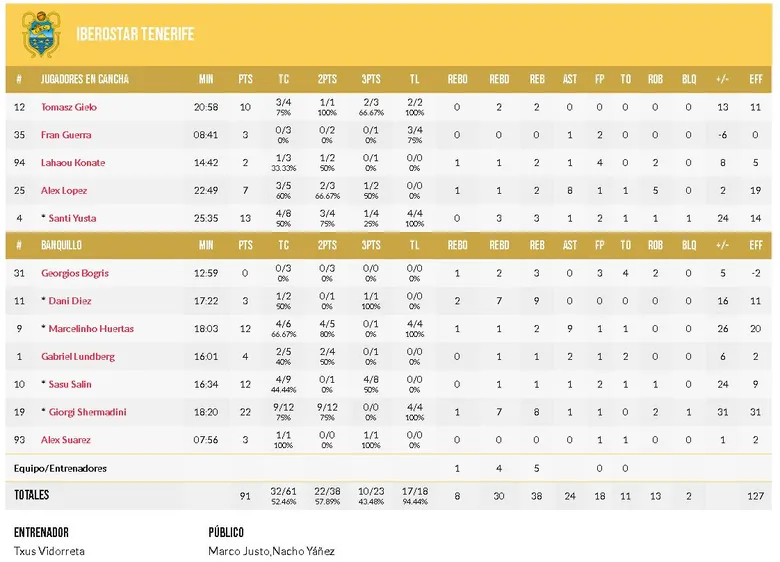 Un acierto exterior como antes acostumbraba: se caracterizaba este equipo de bombardear desde la línea exterior en temporadas pasadas. Sus movimientos de balón y sus aleros siempre bien colocados hacían que ocuparan siempre los primeros puestos en las tablas de acierto desde la larga distancia. No este año. Ahora que el equipo pivota hacia otros puertos, se premia el rebote, se acentúa el juego interior del faro georgiano que todo lo baila. Hoy, sin embargo, ayudado también por la defensa de brazos caídos rival, picaba durante muchas fases del partido el 50% de acierto exterior, para reverdecer viejas armas. Sueña Vidorreta con esa nueva artimaña. De repetirse los porcentajes de hoy en el futuro canarista, el límite de este equipo estará en nuevas cumbres nunca holladas. Hoy, Iberostar Tenerife mostró un acierto exterior que para sí quisiera este año y del que antes tanto alardeaba y acostumbraba.