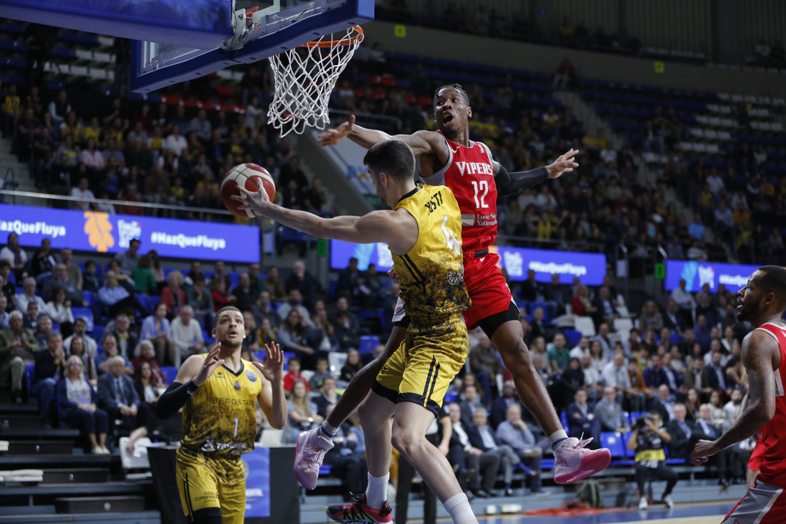 El marcador en los primeros cinco minutos era de 12-15 visitante. Puro estilo NBA. No le gustaba el derroche de puntos a Vidorreta que lo mandaba a parar con 12-20 de puro color rojo. Las rotaciones canaristas paraban la primera sangría. Fran Guerra, con Bogris hoy en los asientos desde los que no se juega, aprovechaba la falta de centímetros en los Vipers para revertir la cosa tras de la primera pausa: 26-24. Esto prometía.