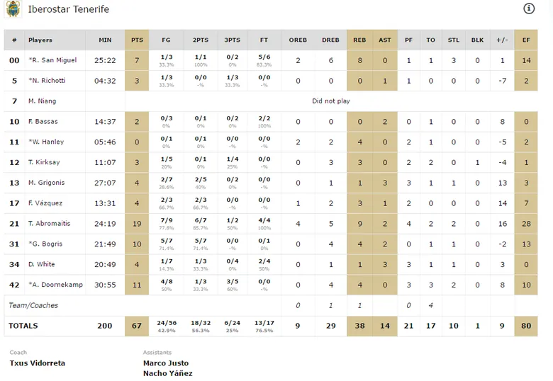Tenía que mejorar sus cartas Vidorreta y a juro que lo hizo. La intensidad de los aurinegros empezaba a crear muros de brazos sobre su aro. Lo protegía hasta el celo más profundo y delante, salía otra de las cartas europeas de los laguneros. Y es que, ¡qué bien le sienta la competición continental a Tim Abromaitis! Suyo fue el triple que empató el partido a 21 y suya la canasta que daba las primeras ventajas a su equipo. Suyos también los siguientes 5 puntos para tomar posesión del marcador y así hasta completar una primera parte soberbia de 17 puntos.