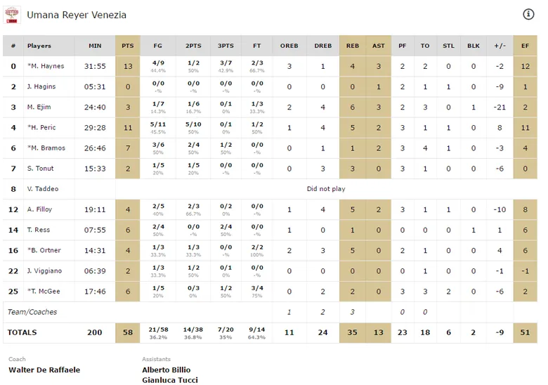 Una de ellas, la defensa. Ese laboratorio de trampas e intensidad a partes iguales que ha sacado de quicio a media de la España baloncestística. Lo mismo ocurre en Europa. Hoy, 58 puntos en contra. Nada nuevo por estos lares. Y eso que comenzaba bastante bien el equipo italiano, con grandes porcentajes desde el tiro exterior (60% en T3) e incluso corriendo para atascar las cartas aurinegras. Así, acababa el primer cuarto con ventaja visitante, con Bramos corriendo contraataques, con Peric aprovechando los cambios de asignación y con Haynes percutiendo desde el 1×1.