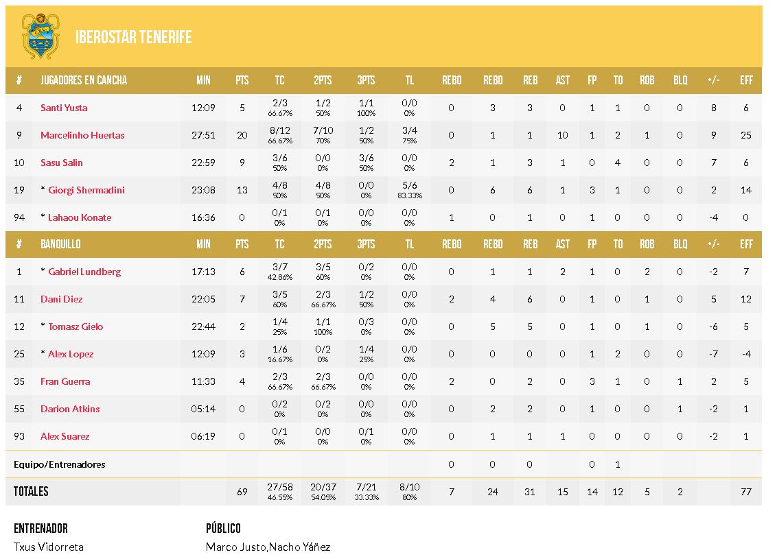 Dos puntos había hecho el máximo anotador de Iberostar Tenerife al descanso. Él, el georgiano, el faro. Dos libres suyos ponían por fin por delante a los de casa a la vuelta de las cabinas.