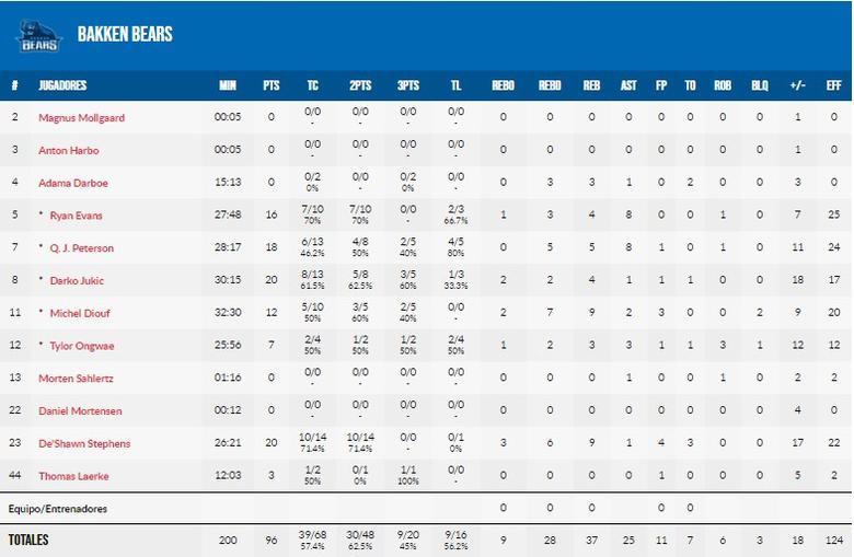 Bakken Bears dio rienda suelta a su calidad ofensiva. El equipo danés ha demostrado su capacidad de anotar puntos durante esta primera fase, siendo los problemas defensivos los que los han dejado fuera de la clasificación. Un partido como el de hoy era ideal que sus anotadores se lucieran ante uno de los grandes equipos de la BCL y no desaprovecharon la oportunidad. El quinteto formado por Peterson, Jukic, Diouf, Evans y Stephens sumaron un total de 86 puntos.