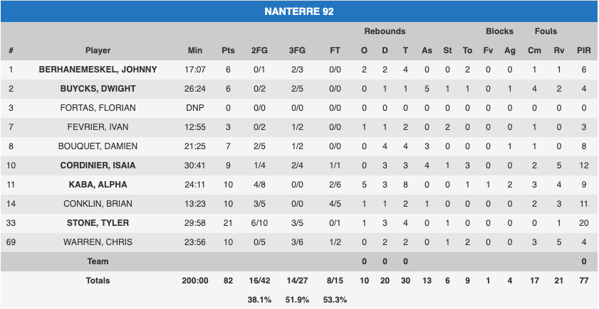 En el inicio del partido, al Gran Canaria le costó igualar el físico del conjunto francés, que tiene jugadores dominantes en este aspecto. El tamaño y la movilidad de Alpha Kaba y Cordinier y la velocidad de Buycks y Warren, otorgaron ventajas significativas a Nanterre, mientras Stone se encargaba de anotar por su cuenta de forma persistente. Shurna, Costello y Wiley lograron aumentar el nivel de la defensa y controlar los rebotes. Los franceses llegaron al final del encuentro en su peor nivel físico y esto derivó en permitir anotaciones muy sencillas a sus rivales. Las individualidades de Stone y el trabajo de Kaba y Conklin, mantuvieron por delante a su equipo, pero el cansancio, no les permitió igualar el salto de calidad que dio el Granca en el último cuarto.