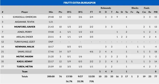 Los jugadores importantes de Bursaspor no tuvieron un buen día. A esto hay que unir que el equipo turco no defiende bien, por lo que necesitan una gran actuación ofensiva de sus estrellas, para ser competitivos. Newman, Mumford, y Perry Jones no estuvieron a la altura que pedía el choque y su nivel ofensivo estuvo lejos de lo habitual. De hecho, el entrenador Acik, cuando la renta en contra superaba la veintena de puntos, puso en pista a un quinteto con cinco jugadores turcos y a los norteamericanos los sentó en el banquillo. El mejor de los turcos fue el veterano Savas, aunque la nota más positiva de la contundente derrota fue la buena actuación del joven Ilyasoglu, con 13 puntos y 9 asistencias. Los turcos mostraron algo más de intensidad en los minutos de la basura, pero el Gran Canaria, con el marcador a favor, jugó muy cómodo y, aunque su acierto e intensidad bajaron, tuvieron el partido controlado en todo momento.