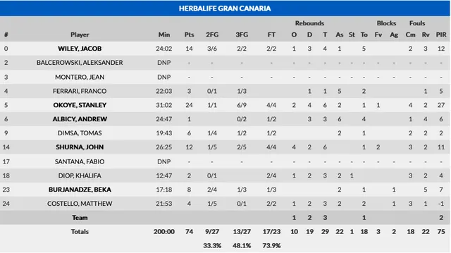 Con 18 puntos en el primer cuarto y 24 al descanso Okoye marcó el ritmo. El Herbalife vivió de la inspiración del alero y del acierto en el triple, ya que cerca del aro el desacierto y las malas decisiones predominaban en la definición amarilla. Cuando se frenó la anotación del norteamericano, el Granca se vino abajo, pasó de tener ventajas en torno a la decena de puntos (25 a 34 con un triple de Okoye que le daba su punto 24) a perder de forma abultada durante todo el resto del partido. Los porcentajes de tiro de dos seguían sin aumentar, mientras el acierto en el triple les mantuvo con opciones hasta el tercer cuarto, cuando las distancias empezaron a estar más cerca de la veintena. Okoye solo hizo tres tiros a canasta en el resto del partido y no anotó ni un solo punto en la segunda parte.