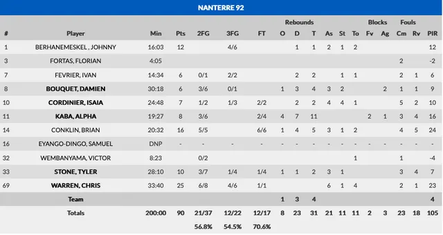 Gran aportación de Conklin saliendo desde el banquillo. En solo veinte minutos de juego, el pívot del Nanterre, Brian Conklin hizo 16 puntos, sin fallo en los tiros (5 de 5 en tiros de dos y 6 de 6 en tiros libres), 5 rebotes y 3 asistencias. Su aportación fue importante, ya que Kaba se cargó pronto de faltas y puso en evidencia la debilidad de la defensa colectiva del Granca. El base, Warren terminó el partido con 25 puntos (6 de 8 en tiros de dos y 4 de 6 en triples) y 6 asistencias, erigiendóse como el líder de un equipo que necesitaba ganar para continuar con opciones de clasificación en este Grupo D.