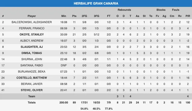 Dimsa y Okoye fueron los mejores del Herbalife en este partido complejo de jugar para ambos equipos por las circustancias que les rodean. Okoye fue el más activo en el ataque amarillo y disputó más de 33 minutos. El alero con pasaporte nigeriano terminó el encuentro con 21 puntos, 6 rebotes, 2 asistencias y 2 robos. El lituano destacó con su 6 de 8 en triples, aunque estuvo mejor que nunca encontrando a sus compañeros y aportó como siempre buena actividad defensiva. Sus números fueron 18 puntos, 5 asistencias y 3 robos de balón