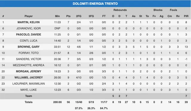 Los italianos salieron con otra cara después del intermedio, pero los malos porcentajes en el tiro de tres puntos y su incapacidad de frenar la sangría de pérdidas les restaba muchas opciones. El ataque amarillo no tenía la misma fluidez, abusando del uno contra uno y generando una cantidad de pérdidas incomprensible (6 en 10 minutos), sobre todo porque la mayoría llegan por un exceso de individualismo y sin que sean errores forzados por el rival. La defensa y el mal día de los tiradores de Trento provocaban que la renta no bajara de la decena de puntos, pero la imagen en ataque de los de Fisac fue mala, aunque la aparición de Beirán y la regularidad de Slaughter acabaron sentenciando el choque. Trento acabó el partido por debajo del 40% en tiros de campo, con solo 10 asistencias, 15 pérdidas, con el balance reboteador perdido con el rival y solo 39 créditos de valoración entre todos los jugadores.
