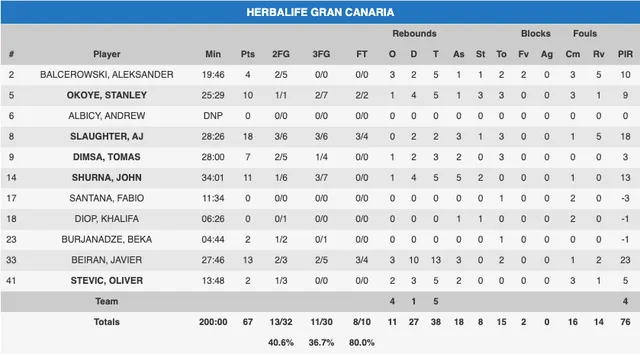 Desde la primera jugada se vio a un Herbalife muy concentrado, con una defensa seria y buen movimiento de balón en ataque. Los canarios dominaron el rebote y el ritmo de juego, por lo que la ventaja no hizo más que crecer hasta que llegó el descanso. Con Slaughter de base y Okoye y Shurna acertados en el tiro exterior, el Granca dominó el choque con una primera mitad completa y equiplibrada. Stevic se cargó muy pronto de faltas y eso dio protagonismo a los pívots jóvenes, con Balcerowski más acertado que Diop. El único lunar de la primera mitad de los amarillos fueron las pérdidas de balón, aspecto que siguen sin controlar con el paso de las jornadas, aunque también en este apartado Trento fue peor que Herbalife (10 pérdidas de los italianos al descanso por 8 del Granca).