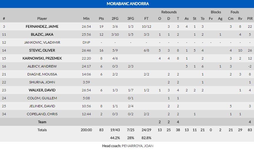 Los andorranos, apáticos en la faceta ofensiva hasta ese momento, empezaron a carburar a partir del minuto 13 coincidiendo con la entrada de Jaime Fernández en pista, que estuvo inconmensurable. Asistía, dirigía, anotaba, robaba y lideraba. Los mejores minutos de MoraBanc Andorra se vieron con Jaime de base, que consiguió anotar 19 puntos, repartir 4 asistencias y capturar 3 rebotes.