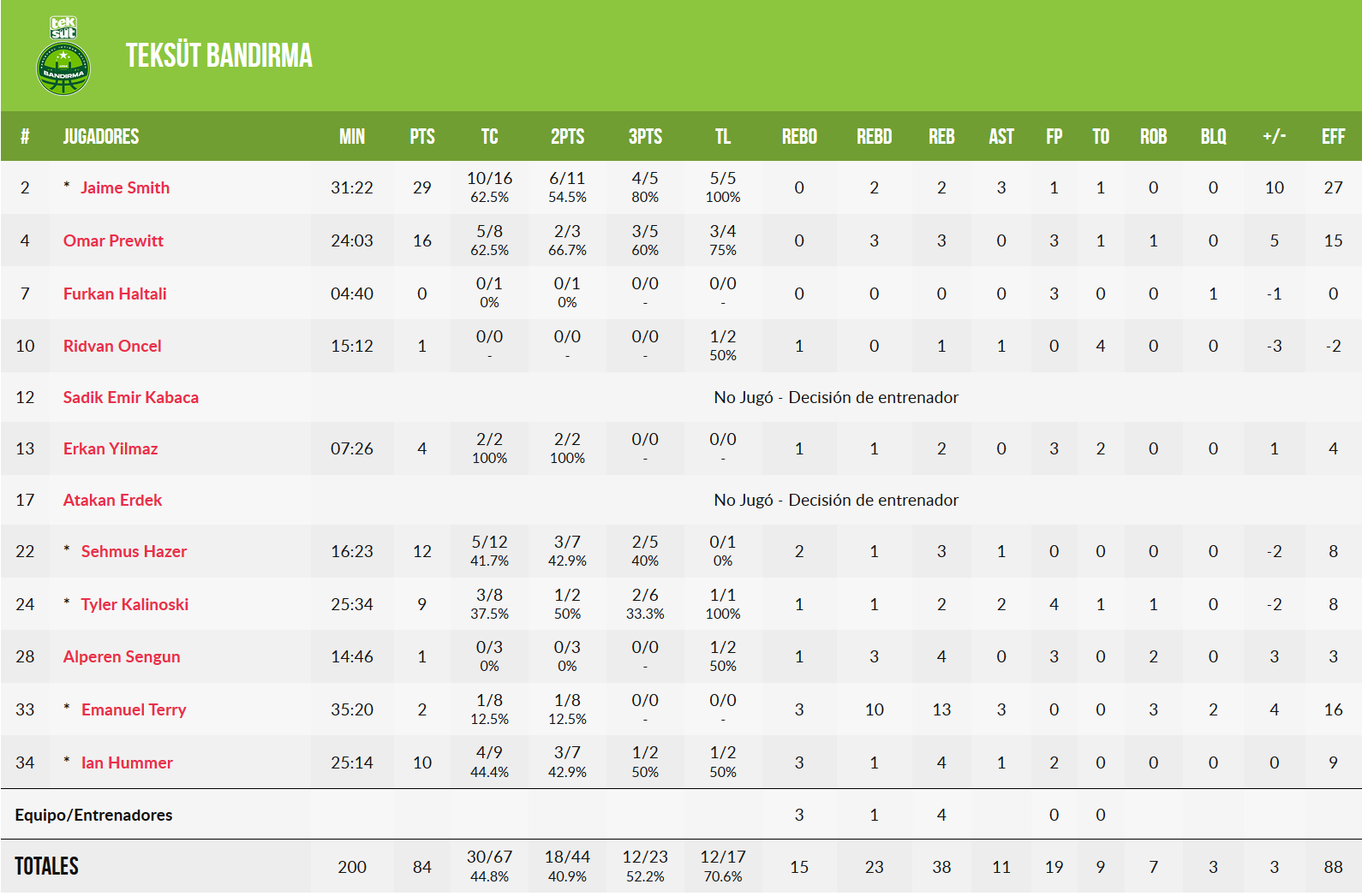 Jamie Smith: El base de los turcos anotó 29 puntos fallando sólo un triple (4/5) y repartiendo 3 asistencias para 27 de valoración. Partidazo el del americano que además jugó con mucha inteligencia los pick & roll y los cambios de defensor y apenas forzó tiros cuando no lo vio claro. Buena mano y buenas decisiones.