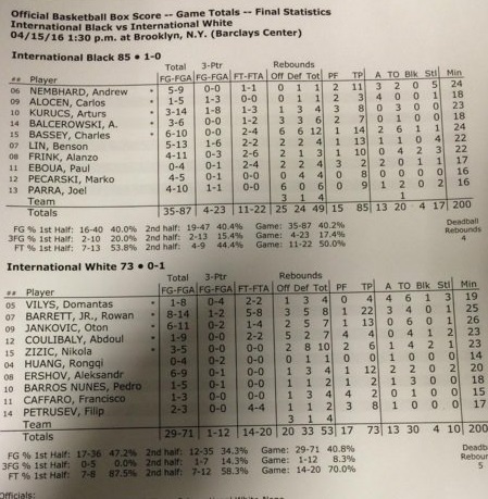 A pesar de un excelente primer cuarto, los International White no pudieron llevarse el partido. El máximo rebotador del equipo fue el azulgrana montenegrino Nikola Zizic, autor de 6 puntos y 10 rechaces. Pero sin lugar a dudas, el mejor jugador en ataque fue el canadiense Rowan Barret J, autor de 22 puntos, 8 rebotes y 3 asistencias. Procedente de la prestigiosa Montverde Academy, uno de los mejores High School de toda norteamérica.