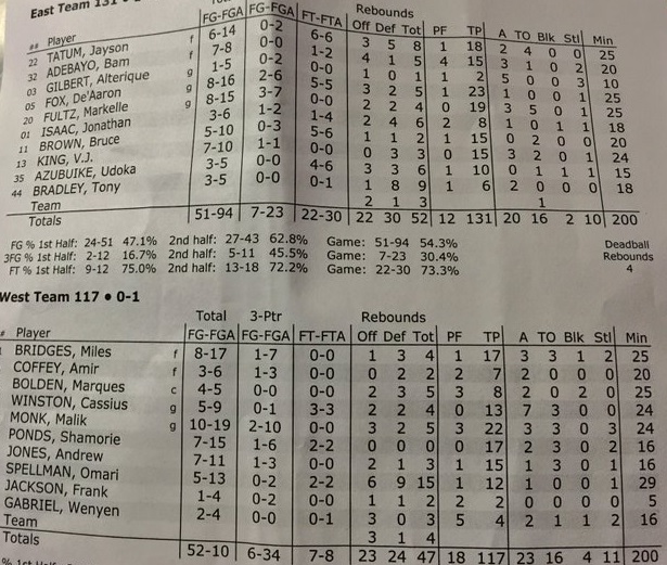El partido transcurrió sin incidencias, salvo por las lesiones en el partido de Alterique Gilbert y Frank Jackson, uno de los MVP,s en el McDonald`s All American. El East Team, fueron superiores claramente en el partido, cuyo resultado final terminó en 131-117, gracias en parte al mejor acierto en sus ataques. Una bateria de jugadores importantes, como Jayson Tatum (18p y 8r), Bam Adebayo (15p), Markelle Fultz (19p y 3/7T3), V.J. King (15p y 7/10Tc) y en especial De`Aaron Fox (23p), fueron los que lideraron a su equipo en la victoria.