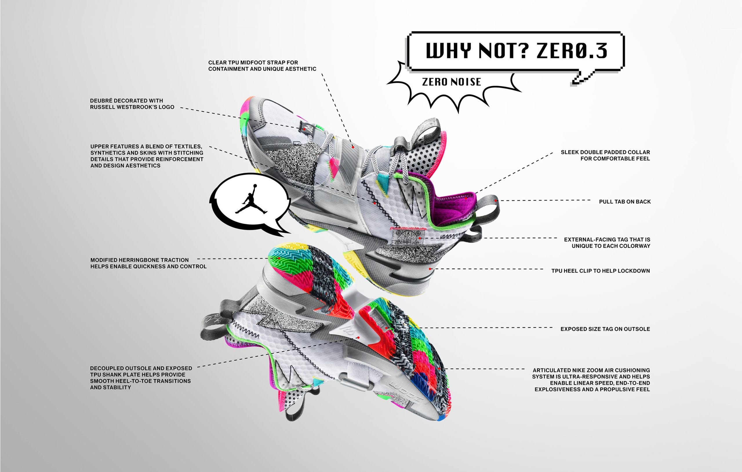 La última signature de Russell Westbrook demuestra su evolución respecto a sus predecesoras . El (hasta ahora) jugador de los Houston Rockets ha participado en el diseño de las Jordan Why Not? Zer0.3, un modelo diseñado para acompañar sus movimientos rápidos y el juego explosivo que suele desplegar sobre el parquet.