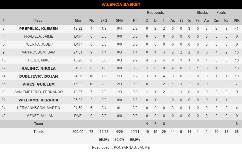 Con la salida de los hombres de banquillo, ganaron los de Ponsarnau. Con la dirección de juego de Sam Van Rossom, que no había sido titular, se vio la mejor versión de los ‘taronja’. Apareció Mike Tobey junto a él en ataque. Y tras ellos, Fernando San Emeterio y Martin Hermannsson se pusieron el equipo a las espaldas y lo llevaron al descanso por delante y teniendo los mejores minutos del partido. Sin embargo, Kevin Pangos evitó que la distancia fuera mayor en los últimos instantes.