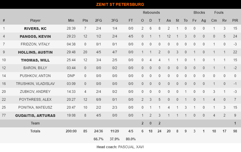 Zenit San Petersburgo ganó en Valencia gracias al gran partido que hizo Kevin Pangos. El jugador brilló al repartir 12 asistencias y dar el guion a su equipo en la victoria. A nivel individual estuvo muy bien con 12 puntos, pero Pangos destacó también en el juego colectivo. Sus asistencias fueron el mejor complemento para Austin Hollins, máximo anotador del encuentro con 20 puntos, Will Thomas y Alex Poythress. Más allá de ello, Pangos fue el gran culpable de la victoria de los suyos ya que cuando Valencia Basket mejor estaba jugando, apareció y evitó que la distancia fuera a más. Y con su perfecta salida en el tercer cuarto, no dejó que el conjunto local pudiera jugar cómodo y se puso en modo MVP para liderar a Zenit de la mejor manera. Sin duda, hoy la victoria rusa tuvo su nombre.