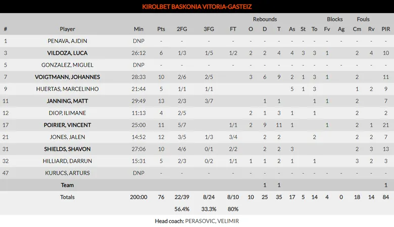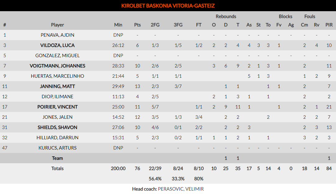 Los dos equipos erraban en la oportunidad de llevarse el average. El baskonia pecaba de ello perdiendo la posesión a falta de 40 segundos con una infracción de 5 segundos en el saque de banda, pero recuperando el balón tras una dudosa jugada donde Baskonia acabó recuperando la posesión. Tanto el partido como el average se resolvería con una canasta in extremis de Vicent Poirer para certificar la victoria y la ventaja por 8 puntos ante un rival directo como lo son los hombres de Dejan Radoncic durmiendo 7º en la clasificación y con el basket average ganado con los equipos que lleva por debajo en la tabla.