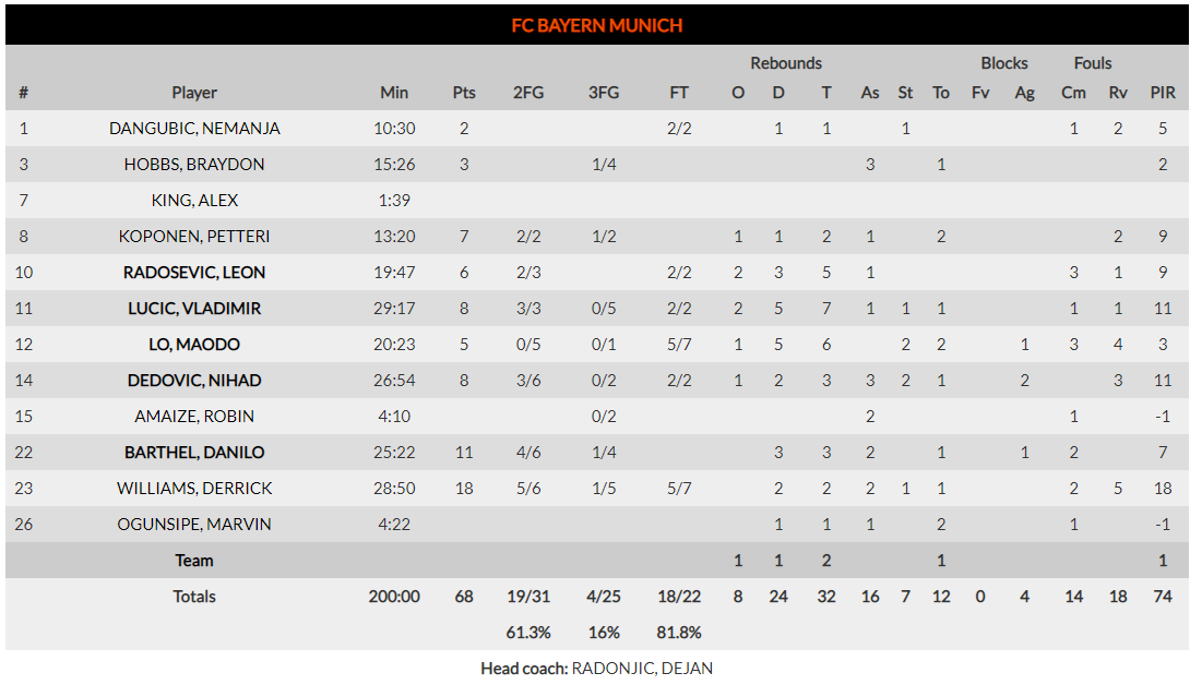 Tiro exterior: Ninguno de los equipos tuvo su día desde la línea de 3, pero Baskonia consiguió lanzamientos de mucho mérito y dos de ellos en un momento clave. Los locales consiguieron un 8 de 24 (33%), mientras que los de Múnich tan solamente lograron 4 triples lanzando un tiro más que los vascos (16%). Esto permitió a que las defensas se cerraran más sin que pudiesen encontrar su dinámica ofensiva.