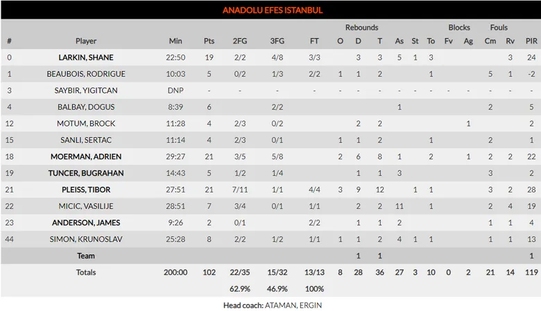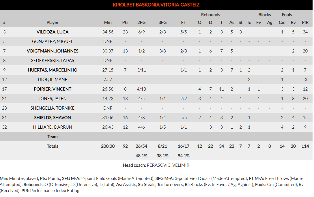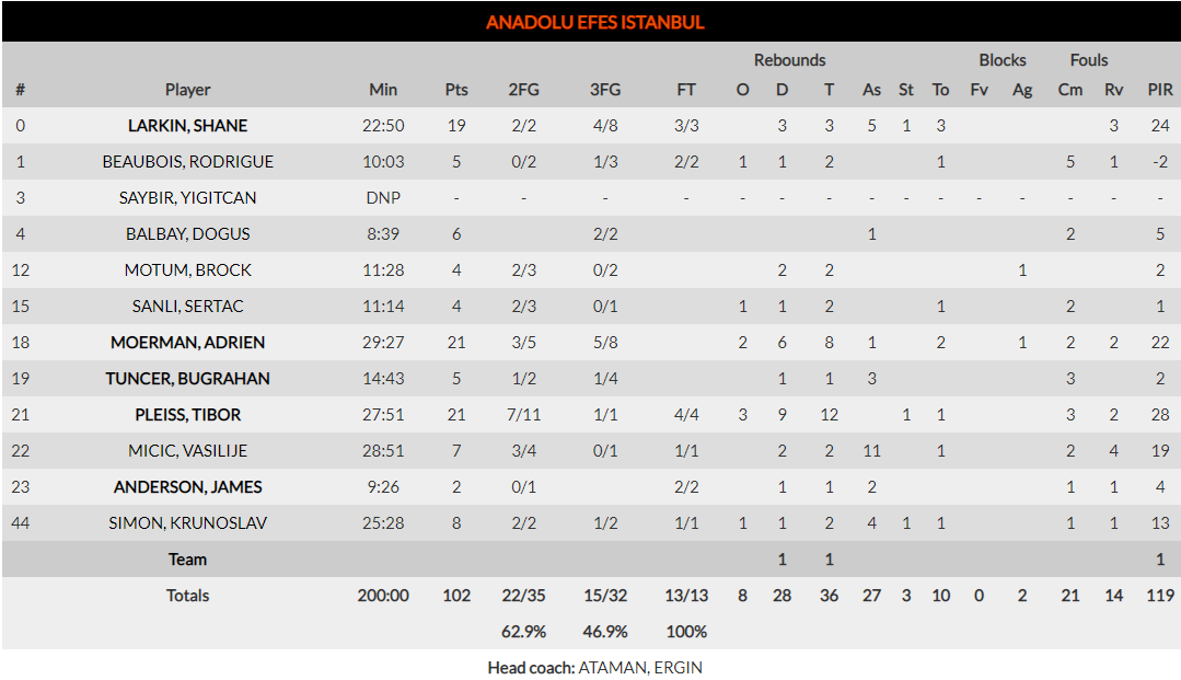 Andrien Moerman y Tibor Pleiss: Entre los dos interiores del equipo otomano anotaron 42 puntos (21 para cada) y 20 rebotes (8+12), El ala-pivot francés hizo picadillo a la defensa baskonista desde el exterior con 5 triples, mientras que Pleiss, a partir de la segunda mitad, comenzó a hacerse dueño de la zona.