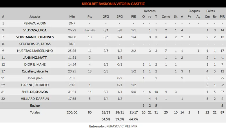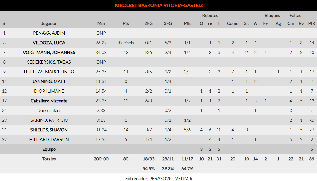 Shavon Shields: En el segundo cuarto entró como un terremoto, dándole la primera gran ventaja al Baskonia tras un 20-1. Un parcial clave en el partido, efectuado en 3 minutos donde el público disfrutó con cada canasta. A pesar de no haber estado tan acertado como al comienzo, también ayudó a su equipo en el apartado defensivo, terminando con 14 puntos, 10 rebotes, 4 asistencias para un total de 27 de valoración.