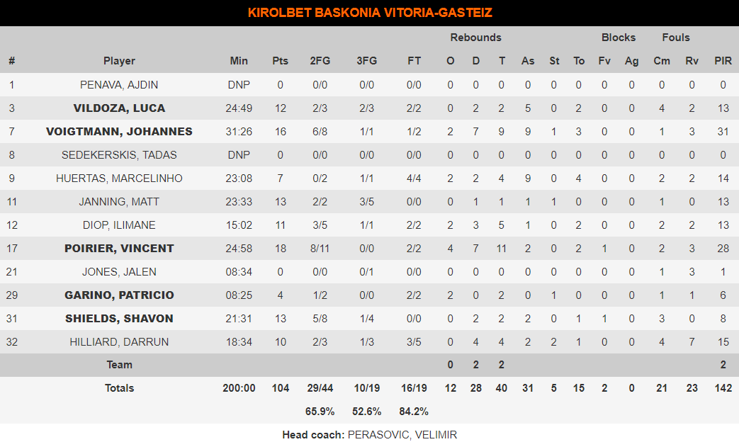 Vincent Poirer y Johannes Voigtmann: Desde el primer momento el pívot francés fue clave para el dominio en la zona de los baskonistas. Por su parte, al alemán le costó algo más entrar en partido, pero en cuanto lo hizo parecía que el Baskonia tenía un multiusos en la cancha. 18 puntos y 11 rebotes de Poirer, para un total de 28 de valoración y 16 puntos, 7 rebotes y 9 asistencias para Voigtmann que se proclama MVP del partido con 31 de valoración.