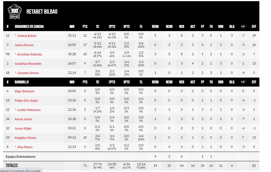 Cada canasta es un gol: No consigue encontrar el camino al aro RETAbet Bilbao en esta primera parte de campaña, que da la sensación de que en cada ataque se encuentran en un laberinto con los ojos cerrados. Tan solo Balvin de forma regular y la garra de Rousselle en ciertos momentos consiguen producir acciones positivas en ataque. En el día de hoy no iba a ser menos, Balvin fue el faro y tan solo encontró apoyo en los chispazos de Brown. Si le sumamos que la anotación exterior no es la principal arma de este equipo y la falta de claridad obliga a tomar tiros forzados, el resultado es 4/24 en triples y 27/74 en tiros de campo. Preocupante situación para los MIB, que tampoco mitigan la falta de acierto con una defensa dura.