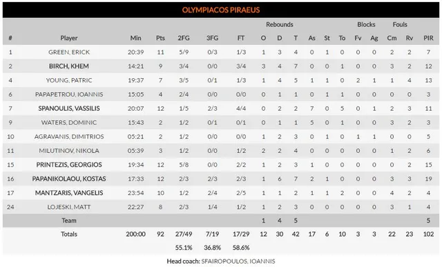 El Olympiakos más coral. El partido estaba roto, y Baskonia estaba absolutamente desquiciado, mientras que Olympiakos seguía apretando las tuercas y masacrando continuamente a los alaveses. Habían puesto el rodillo en marcha, y son pocas las veces que Olympiakos saca a relucir su faceta más ofensiva. Todos los jugadores del conjunto griego anotaban algún punto; y Kostas Papanikolau (10 puntos, 6 rebotes) aprovechaba el buen momento de su equipo, para subirse a la ola y firmar sus mejores minutos de la temporada en Euroliga, el alero griego dejaba fogonazos del jugador que enamoró a Europa.