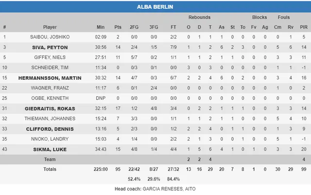1. Alba Berlín más interior. El pasado martes, en el primer partido, el equipo de Aíto sobrevivió por el triple, sin embargo, en este encuentro, preparó un encuentro totalmente distinto, basado en balones interiores y en mayor juego. Prueba de ello fue también la mayor participación de Giedraitis (17 puntos) y Sikma (15 puntos). Además, dirigiendo el juego estuvieron mucho más acertados Siva y Hermannsson con 14 puntos cada uno. También, solucionaron uno de los principales problemas en el pasado partido, que fue el rebote. Ganaron en el rebote defensivo con 13 capturados frente a 9, aunque en general, en ataque los taronja fueron mejor y ganaron en rebotes totales (29 frente 31).