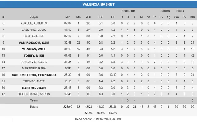 3. Van Rossom, casi héroe. El gran protagonista en el partido del martes fue Will Thomas, y aunque hoy el americano también hizo un gran encuentro, el que mantuvo a Valencia con opciones de victoria fue Sam Van Rossom, su ritmo y su gran acierto en el tiro exterior. Tiros geniales que casi le convirtieron en el héroe de la cuarta EuroCup de Valencia Basket, pero no pudo ser. 22 puntos, 3 rebotes y 3 asistencias para el base belga, que estuvo muy bien apoyado por Will Thomas (15 puntos, 4 rebotes y 5 asistencias) y San Emeterio.