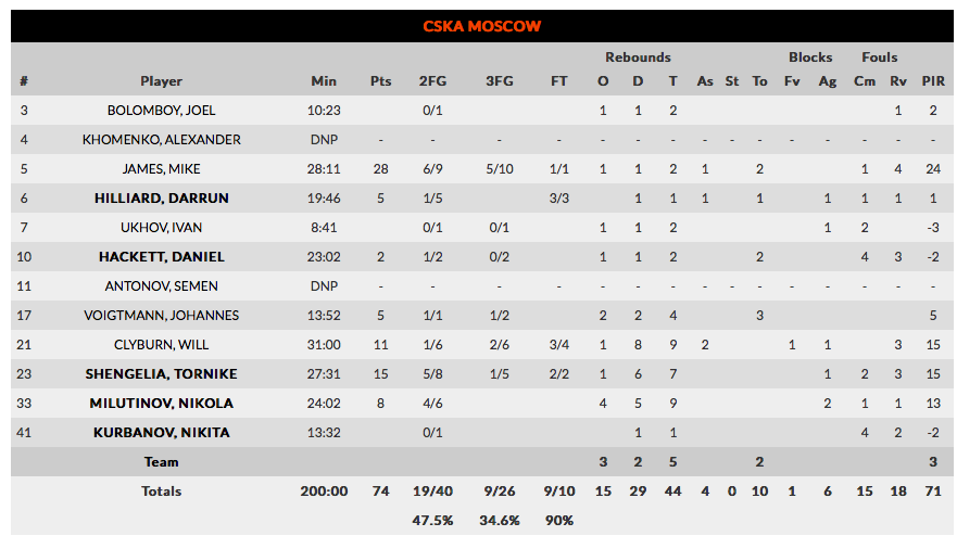 Los rusos se llevaron un encuentro duro defensivamente, 74-73, entre dos equipos que son pura tinamita anotadora. Los de Itoudis dominaron el rebote (39), a pesar de que Tavares acabó con 10. Destacar que solo dieron 4 asistencias en todo el partido frente a las 18 de los blancos. Un juego basado en el uno contra uno, sobre todo de su estrella Mike James. Precisamente uno de los jugadores más valorados junto a Walter Tavares. Mala noticia la lesión de Carroll, que se retiró a vestuarios sin poder pisar.