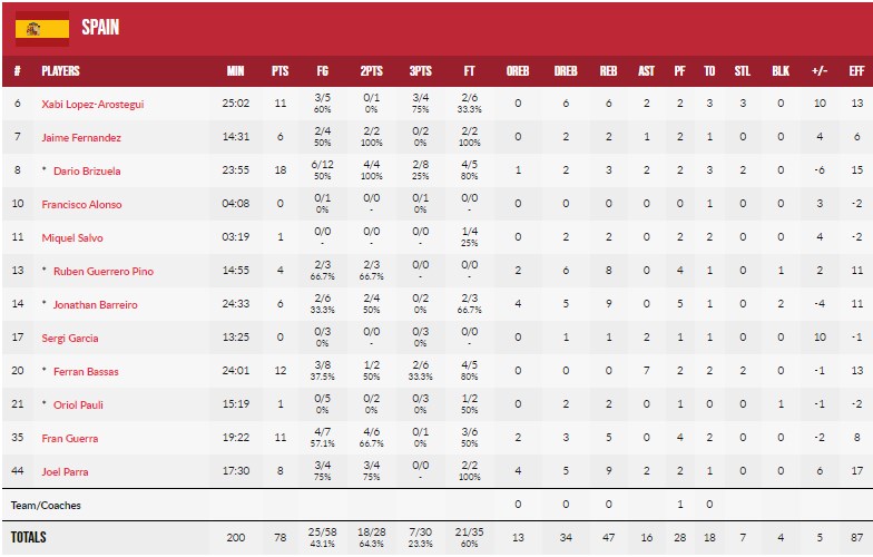 La selección española dominó el rebote para acabar con 47 a 29 a su favor. Para ganar esta batalla tuvo que sobreponerse a las faltas personales de Fran Guerra y Rubén Guerrero, únicos interiores puros disponibles al no ser Víctor Arteaga de la partida. Ambos cincos realizaron un buen partido, con Guerrero reboteando y Guerra haciendo daño en ataque, pero solo estuvieron 14:55 minutos el de Unicaja y 19:22 el de Lenovo Tenerife. Pero la selección contaba hoy con dos gladiadores como Barreiro y Parra, que incluso tuvieron que formar pareja interior algunos minutos. El de Zaragoza no estuvo al nivel de acierto que lo llevó a ser el MVP del partido contra Polonia pero aportó 9 rebotes y fue decisivo. El canterano de la Penya realizó un grandísimo partido en su segundo día con la selección, siendo el más valorado del encuentro con 17, gracias a sus 8 puntos y 9 rebotes.