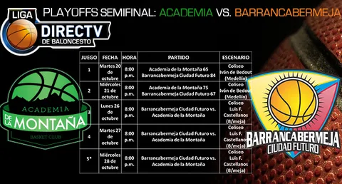 La primera semifinal entre Academia y Barrancabermeja se haya con empate a uno y tendrá partidos en lunes, martes y miércoles que definirán el primero de los finalistas de este segundo semestre de la Liga Directv 2014, donde seguro volverán a ser protagonistas el boricua Jezreel de Jesús y el dominicano Gerardo Suero, como lo han venido siendo a lo largo del torneo.