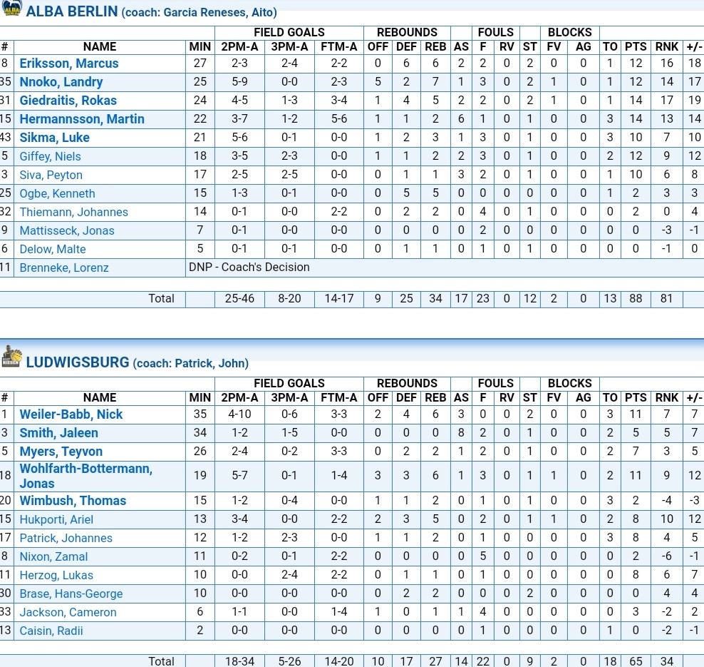 Solamente flaquearía Alba al comienzo del encuentro, cuando Peyton Siva y Luke Sikma tuvieron que ser reemplazados al cometer ambos su segunda falta personal, lo que aprovechó Ludwigsburg para tomar la delantera, 7-8, min.5.