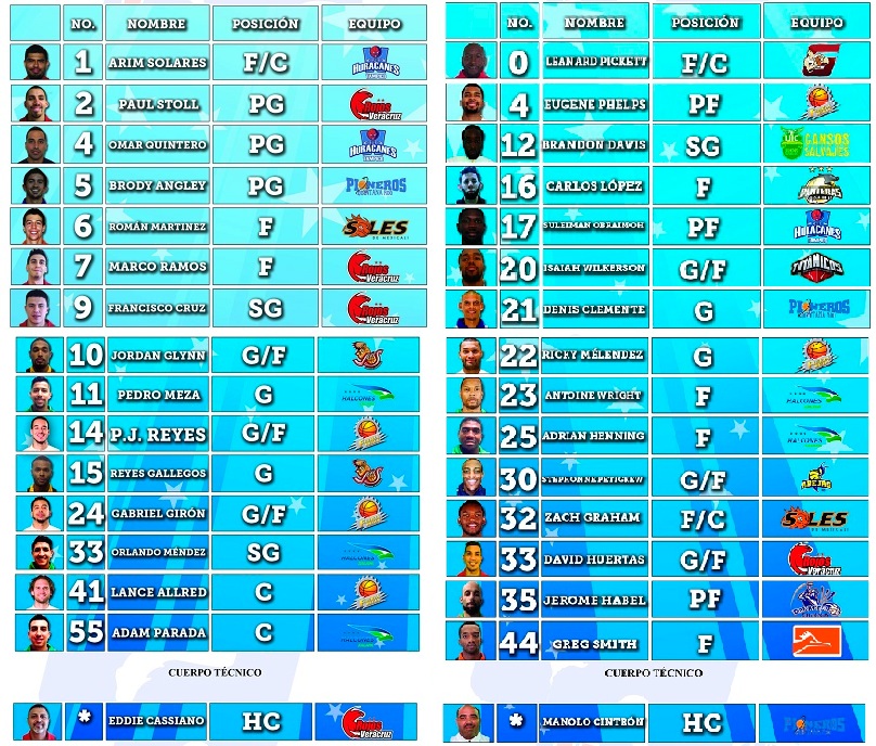 El equipo de jugadores extranjeros lo formaron Eugene Phelps y Ricky Meléndez (Fuerza Regia), David Huertas (Halcones Rojos), Adrian Henning y Antoine Wright (Halcones Xalapa), Zach Graham (Soles), Denis Clemente (Pioneros), Suleiman Braimoh (Huracanes), Greg Smith (Correcaminos), Carlos "Yao" López (Panteras), Steffphon Pettigrew (Abejas), Jerome Habel (Barreteros), Isaiah Wilkerson (Titanicos), Leonard Pickett (Gigantes) y Brandon Davis (Gansos Salvajes), siendo dirigidos por el también boricua Manolo Cintrón.