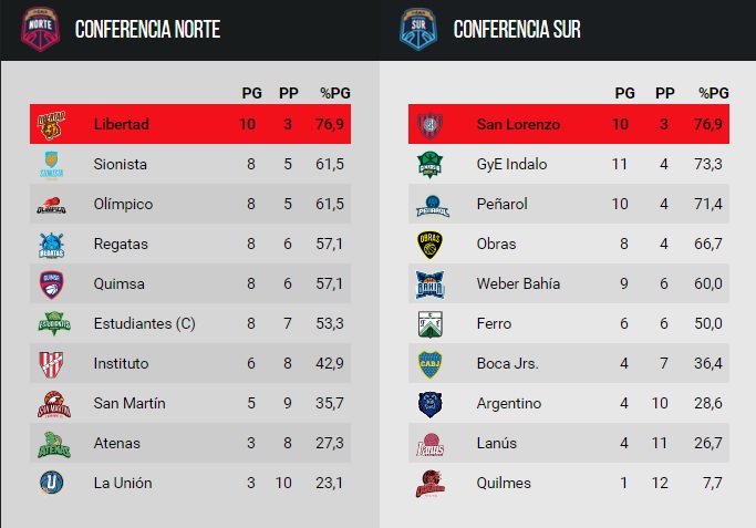 En la parte de abajo, anteúltimo se encuentra Atenas de Córdoba, el equipo más ganador de la Liga Nacional con un record de 3-8 y último La Unión de Formosa, que había empezado de manera tan buena la temporada, sufrió el cambio de extranjeros y lleva cinco derrotas en forma consecutiva.