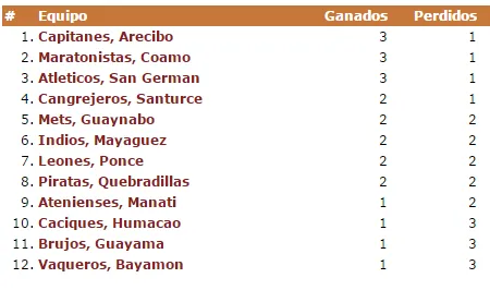 Los Maratonistas de Coamo comenzaron la liga con un 3-1, tomando las cosas donde las dejaron en el torneo preparatorio de hace unas semanas donde se proclamaron campeones invictos. Acumulan victorias ante Guayama, Guaynabo y Manatí; pero hoy sufrieron su primera derrota de la temporada ante los Caciques de Humacao que recién descubren el sabor de la victoria.