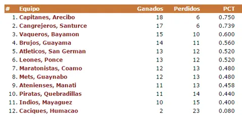 El subcampeón Capitanes de Arecibo se mantiene como líder tras ganar en casa a Maratonistas, Piratas y Atletícos y cayó en su visita al Rancho Vaquero de Bayamón. Los que siguen detrás y deja ya de ser una sorpresa para convertirse en una realidad son los Cangrejeros de Santurce del español Paco Olmos, que incluso se llegaron a ponerse líderes esta semana y también presentan un balance de 3-1.