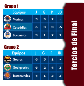 A día de hoy, Marinos de Anzoátegui es ya está clasificado matemáticamente por el grupo A y serán Bucaneros y Cocodrilos los que peleen por la plaza restante con duelo directo de por medio: Cocodrilos será el equipo clasificado si ganan la serie en casa de Bucaneros. En otro caso, tendrán que esperar a lo que haga el conjunto de Luis Guil en su última serie en el campo de Marinos, mientras que clasificará Bucaneros si gana la serie en casa ante Cocodrilos o consiguiendo una victoria ante el conjunto saurio y barriendo a Marinos en su casa en la serie definitiva de los tercios de final
