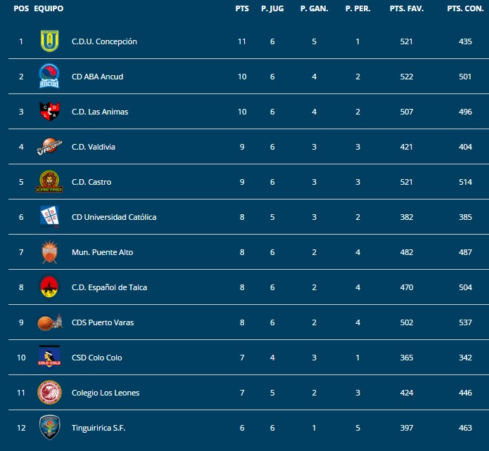 La parte alta de la clasificación sigue siendo cosa de Universidad de Concepción, ABA Ancud y Las Ánimas. Los tres equipos consiguieron dos victorias esta semana y ocupan las tres primeras posiciones. El equipo de Valdivia tuvo el impulso del pívot Terrell Taylor, que fue el jugador con mejores números de la semana, sumando 25 puntos y 15 rebotes ante Tinguiririca, y 26 puntos, 13 rebotes y 6 asistencias en la visita a Español de Talca.